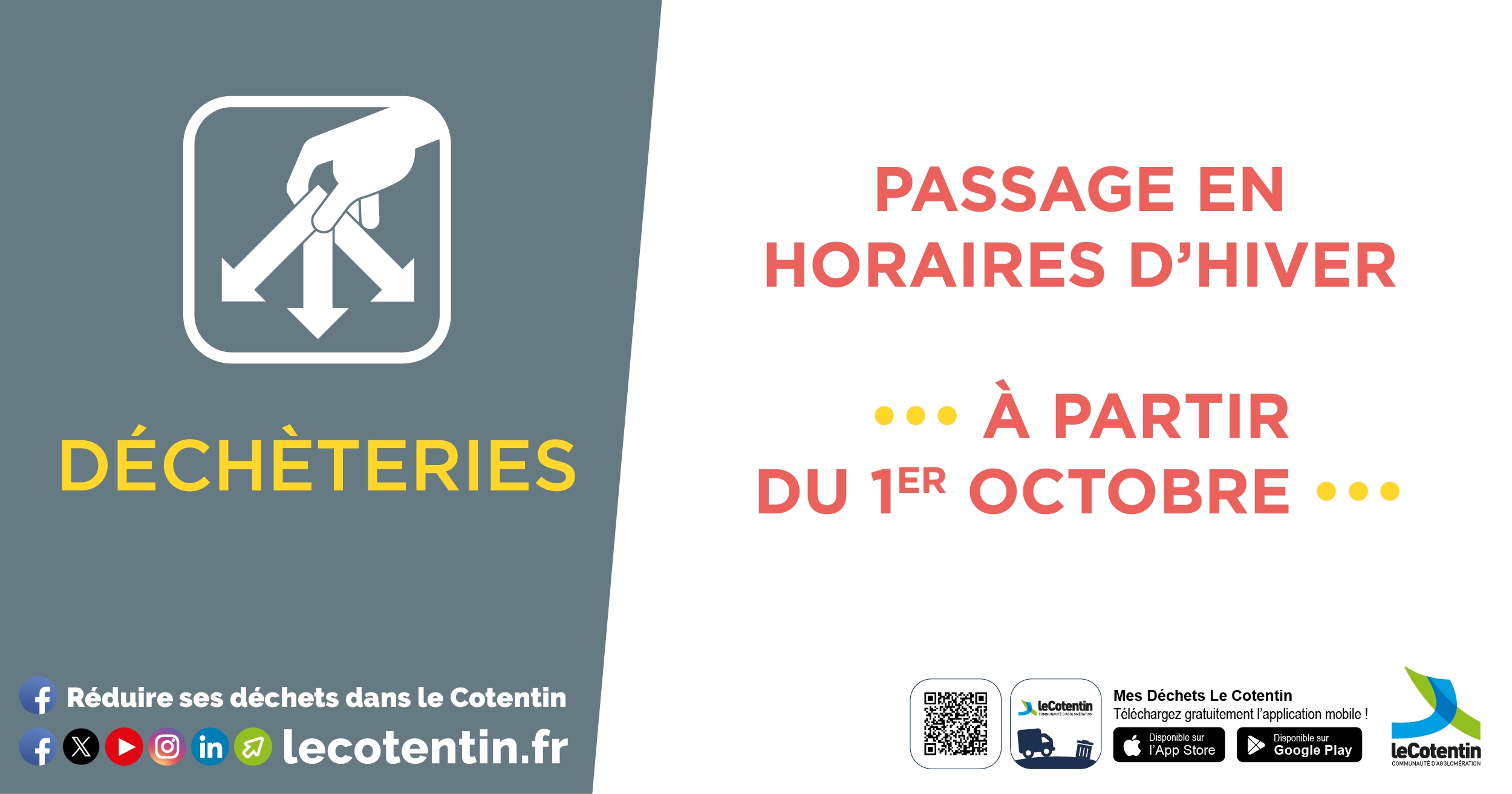 Passage aux horaires d'hiver des déchetteries du Cotentin au 01 octobre 2025.