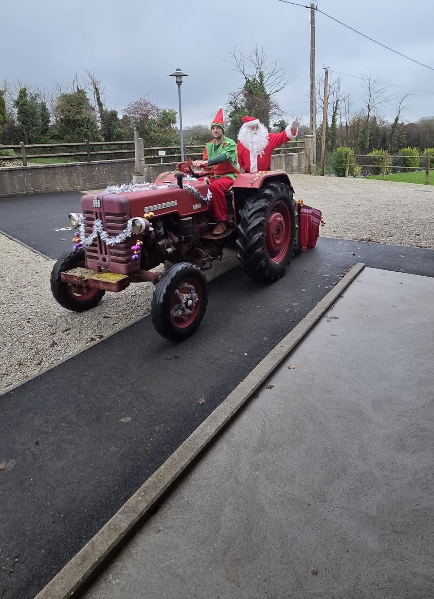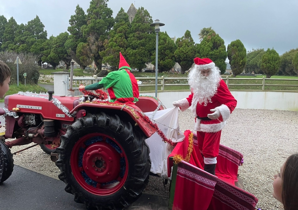 Ensuite ce fut l'arrivée du Père Noël, qui cette année est venu en tracteur conduit par un lutin. Après avoir salué l'assistance et demandé aux enfants si ils avaient été bien sages, le Père Noël a procédé à la remise des cadeaux à chacun des enfants présents, avant de reprendre sa tournée.Des conseillères municipales avaient préparé le goûter, en confectionnant des crêpes, et en disposant sur les tables différentes friandises, gâteaux, chocolats, mandarines...