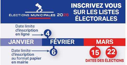 Afin de participer aux élections, tout citoyen doit s’inscrire sur la liste électorale de sa commune jusqu’au sixième vendredi précédant le scrutin, soit jusqu'au 06 février 2026, delai de rigueur en Mairie.
